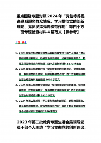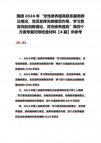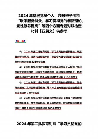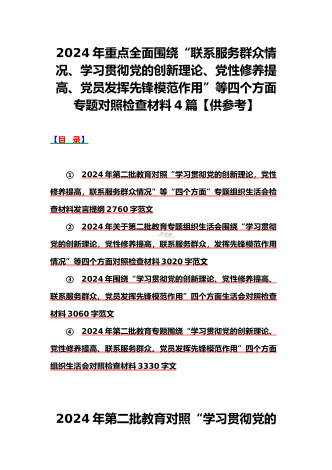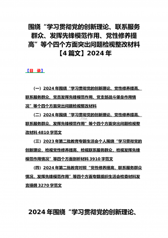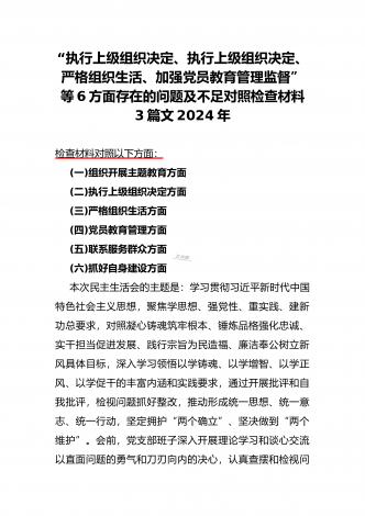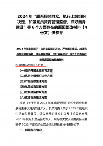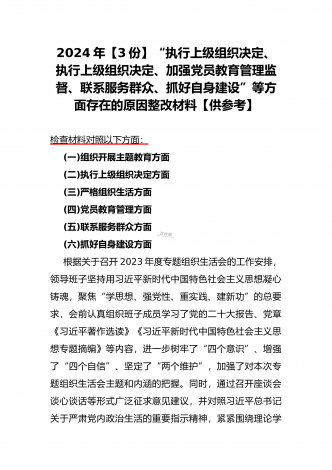 2024年党支部班子“执行上级组织决定、执行上级组织决定、严格组织生活、加强党员教育管理监督、联系服务群众、抓好自身建设”六个方面存在的原因整改材料3篇文【供参考】检查材料对照以下方面:(一)组织开展主题教育方面(二)执行上级组织决定方面(三)严格组织生活方面(四)党员教育管理方面(五)联系服务群众方面(六)抓好自身建设方面本次组织生活会聚焦的议题是深入领会习近平新时代中国特色社会主义思想,本会议以学习思想、增强党性、注重实践、创造新功为核心要务,针对凝聚人心锻造灵魂之基、砥砺品质坚定忠诚之志、...
