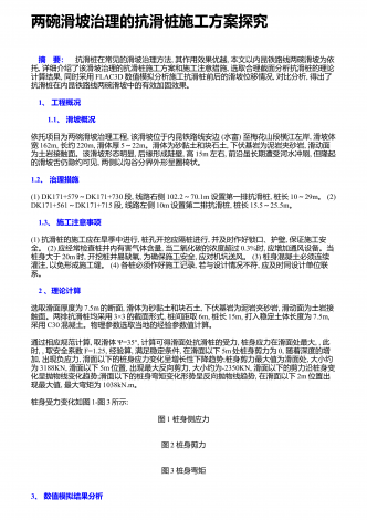 两碗滑坡治理的抗滑桩施工方案探究 摘 要: 抗滑桩在常见的滑坡治理方法, 其作用效果优越, 本文以内昆铁路线两碗滑坡为依托, 详细介绍了该滑坡治理的抗滑桩施工方案和施工注意措施, 选取合理截面分析抗滑桩的理论计算结果, 同时采用FLAC3D数值模拟分析施工抗滑桩前后的滑坡位移情况, 对比分析, 得出了抗滑桩在内昆铁路线两碗滑坡中的有效加固效果。 1 、工程概况 1.1 、滑坡概况依托项目为两碗滑坡治理工程, 该滑坡位于内昆铁路线安边(水富) 至梅花山段横江左岸, 滑坡体宽162m, ...