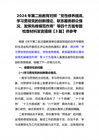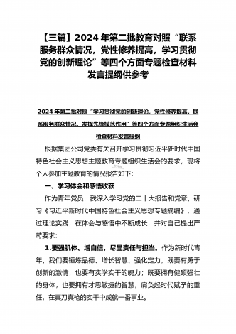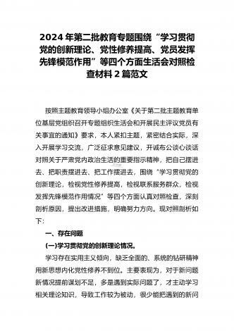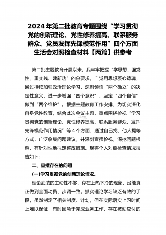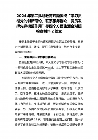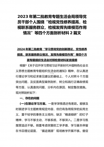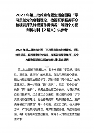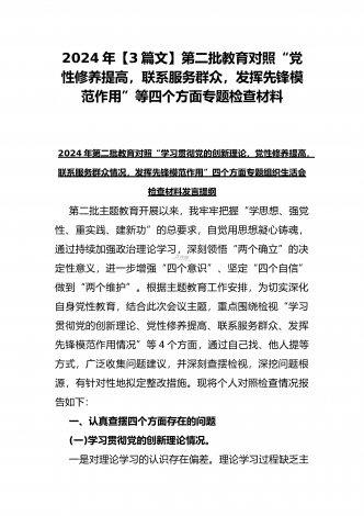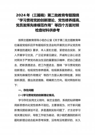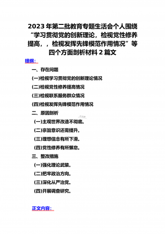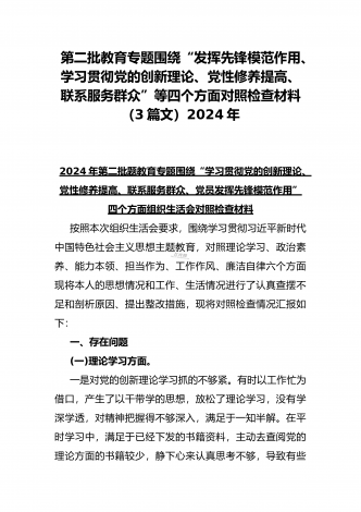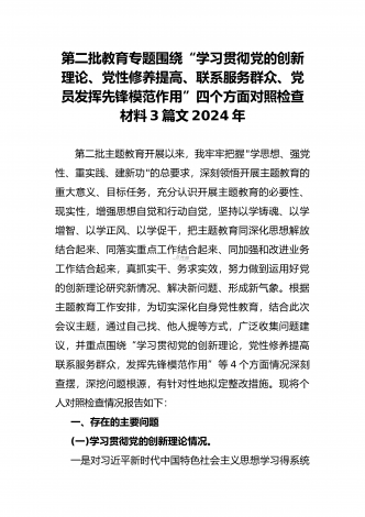 基层党员个人2023年第二批教育专题围绕“学习贯彻党的创新理论,检视党性修养提高,检视联系服务群众,检视发挥先锋模范作用情况”四个方面剖析检查材料(3篇文)供参考