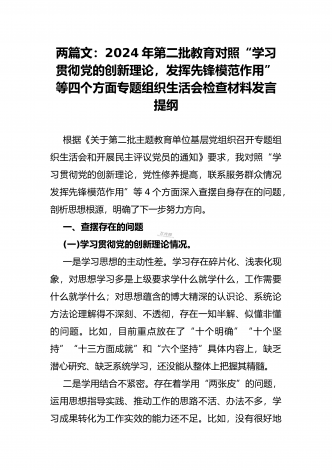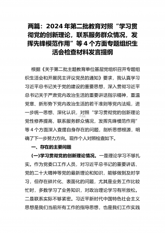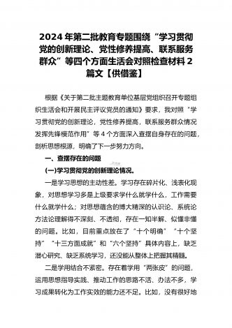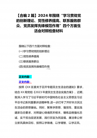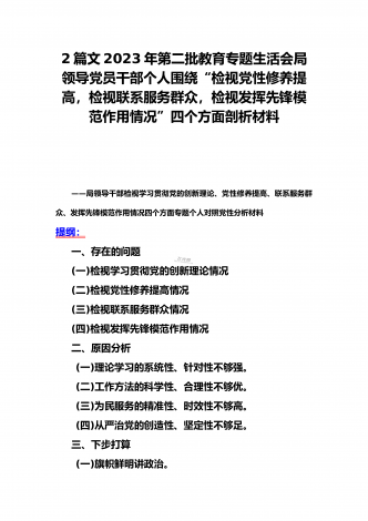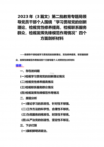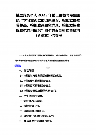 基层党员个人2023年第二批教育专题围绕“学习贯彻党的创新理论,检视党性修养提高,检视联系服务群众,检视发挥先锋模范作用情况”四个方面剖析检查材料(3篇文)供参考——基层党员检视学习贯彻党的创新理论、党性修养提高、联系服务群众、发挥先锋模范作用情况四个方面专题个人对照检视剖析检查材料提纲:一、存在问题(一)检视学习贯彻党的创新理论情况。(二)检视党性修养提高情况。(三)检视联系服务群众情况。(四)检视发挥先锋模范作用情况。二、产生问题的根源。(一)党性修养不牢固。(二)宗旨意识不强。(三)理想信...