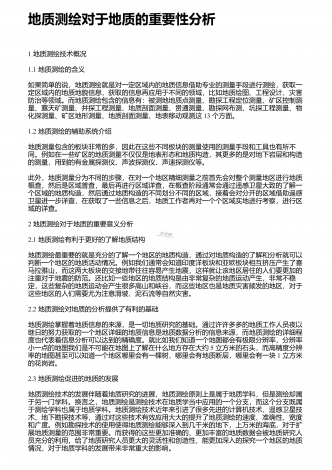 地质测绘中测绘新技术的运用分析 摘要:随着我国经济、文化等方面的长足进步,在现代化的推进过程中,人们所拥有的科技水平也越来越高,测绘技术也由传统的模式走向数字化和自动化,在地质测绘工程中测绘新技术也发挥了重要作用,同时地质测绘工作完成的质量高低也决定着国民经济的发展速度快慢和社会可持续发展稳定性的高低。本文主要分析了目前测绘技术的发展现状,提出了几条传统测绘技术中存在的缺陷和不足,介绍了测绘新技术具有的特点,如数字化、自动化等,并提出了几条测绘新技术在地质测绘工程方面的具体应用,如在地理信息系统...