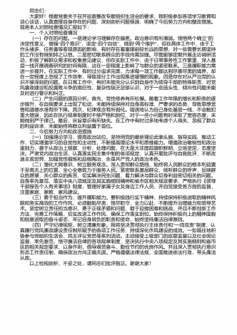 同志们: 按照县委的统一安排,我联系x党委(党组)。刚才,听了大家的发言,很受教益和启发。会议既有红脸出汗的严肃紧张,又有加油鼓劲的宽松和谐,对每一位同志来说,都是一次十分难得、终生难忘的党性锻炼。 会前,我查看了x班子和各位班子同志的对照检查材料,刚才,x“同志汇报了不忘初心、”“”“”牢记使命专题民主生活会和中央脱贫攻坚专项巡视回头看整改暨深化三个以案警示教育专题民主生活会整改措施落实情况,并代表班子作了对照检查,各位班子成员认真开展了对照检查,严肃进行了相互批评。大家的自我批评不怕...