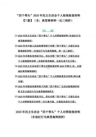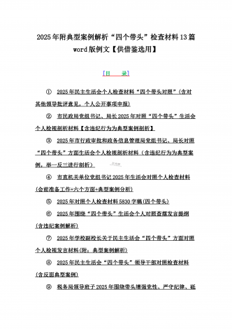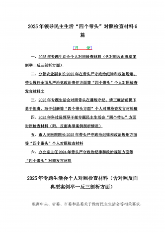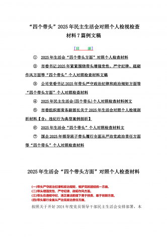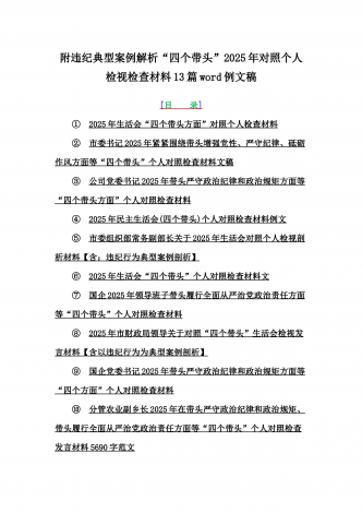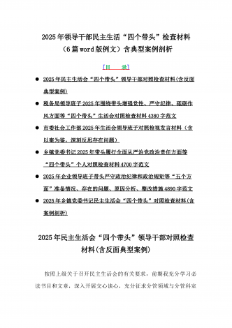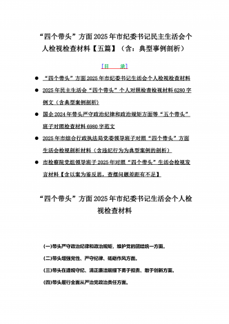 2025年专题聚焦“四个带头”方面个人对照检查检视发言材料12篇word版例文(含反面典型案例,举一反三进行剖析)供参考【目录】(1)市林业局党委书记2025年生活会个人对照检查材料(含:典型事例剖析)(2)2025年专题生活会对照检查发言材料【四个带头】(3)市委书记2025年紧紧围绕带头增强党性、严守纪律、砥砺作风方面等“四个带头”个人对照检查材料4170字范文稿(4)2025年领导班子民主生活会“四个带头”方面对照检查材料(上年度整改+准备情况)(5)2025年市财政局党组书记、局长对照“...