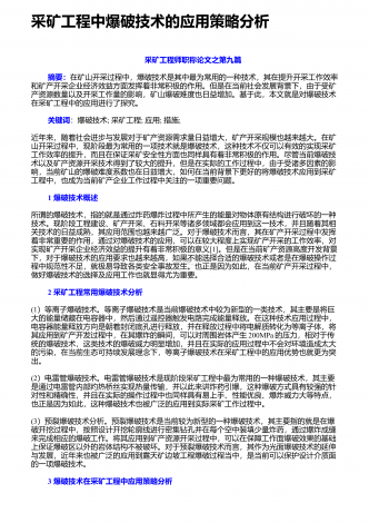 爆破技术在采矿工程的应用研究 采矿工程师职称论文之第四篇摘要:随着科学技术水平的不断提高,采矿工程的爆破技术应用也相应有了突破性进展。从不同角度剖析了爆破技术在采矿工程中的应用情况,明确了爆炸与炸药在采矿工程中应用的理论基础,并对爆破技术的外在表现形式及操作步骤展开探讨,以及对采矿工程爆破技术的具体应用情况等展开相关分析。明确爆破技术在采矿工程中的应用必须以安全为主,需根据不同地质要求,结合实际情况,提出相应的技术方案,才能提高整体工作效率。 爆破技术是利用炸药对物体结构进行巨大能量的爆炸,近...