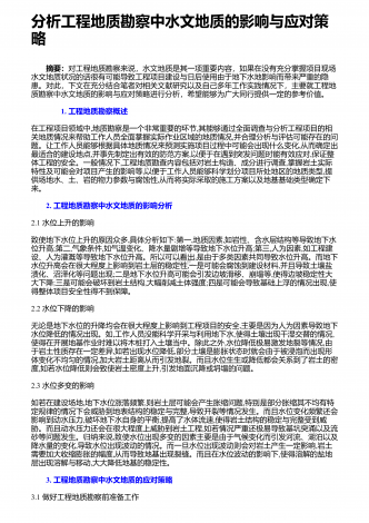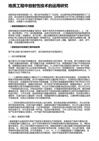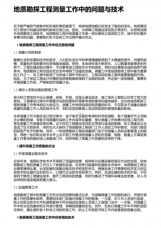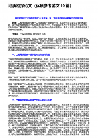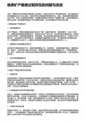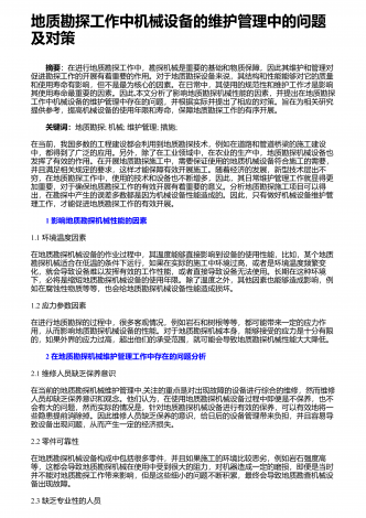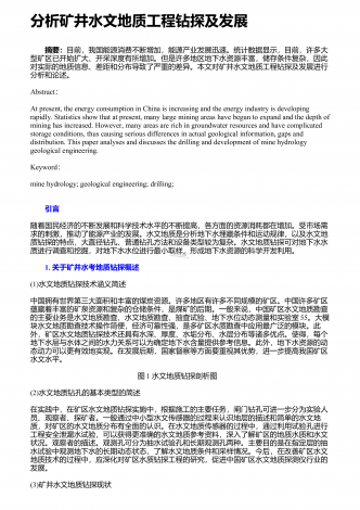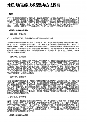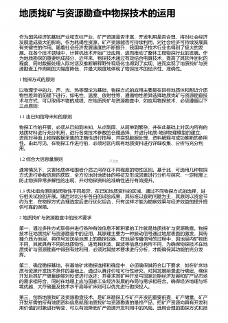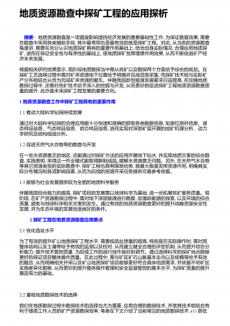 地质资源勘查中探矿工程的应用探析 摘要:地质资源勘查是一项直接影响国民经济发展的重要基础性工作,为保证勘查效果,需要在勘查中采用各类辅助手段,其中最常用也是最有效的就是探矿工程。对此,从当前的资源勘查角度讲,需要在充分认识地质探矿具有的重要作用基础上,结合自身实际情况,合理应用地质探矿,进而在保证安全性与有序性的基础上,使地质探矿发挥理想作用效果,从而不断促进矿产经济未来发展。根据相关研究结果显示,现阶段地质勘探当中需从找矿以及勘探两个方面给予综合的规划。在探矿工艺选择过程中需对矿床资源地下位置...
