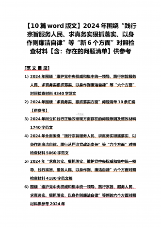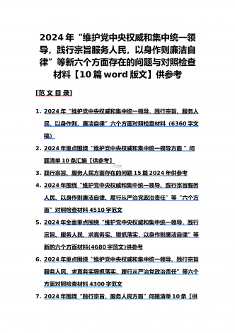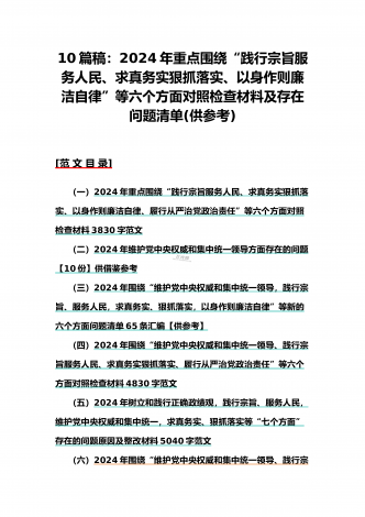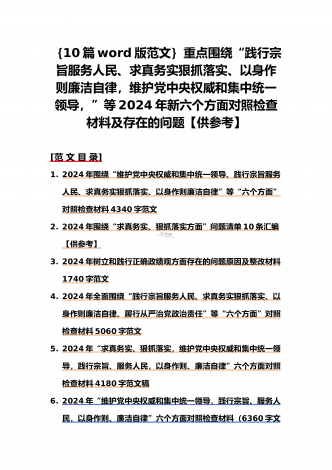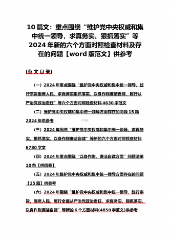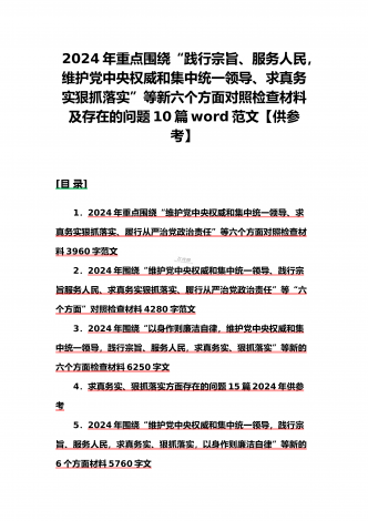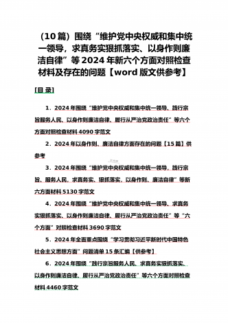 {10篇word版范文}重点围绕“践行宗旨服务人民、求真务实狠抓落实、以身作则廉洁自律,维护党中央权威和集中统一领导”等2024年新六个方面对照检查材料及存在的问题【供参考】
