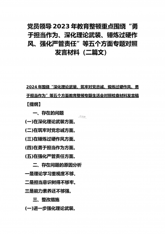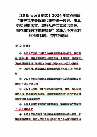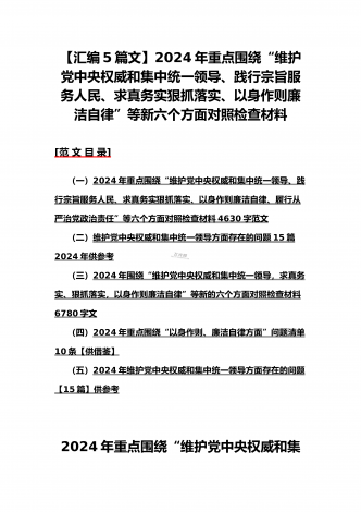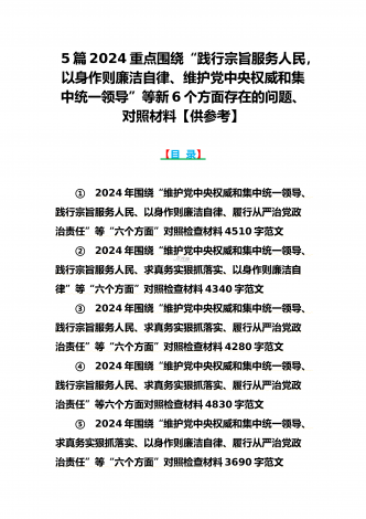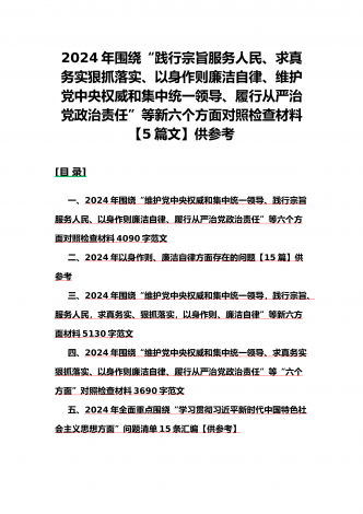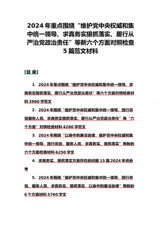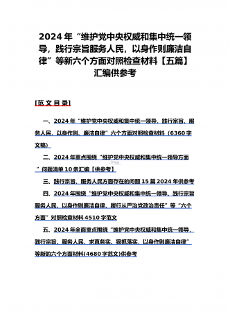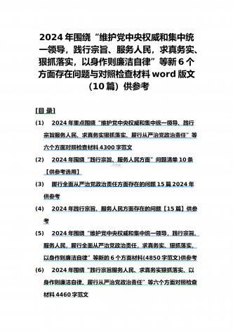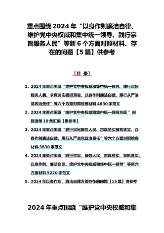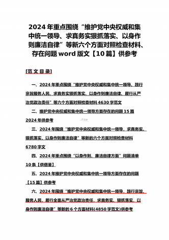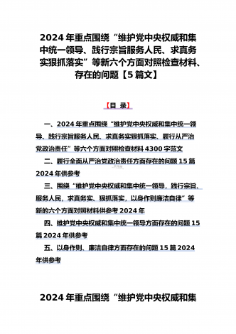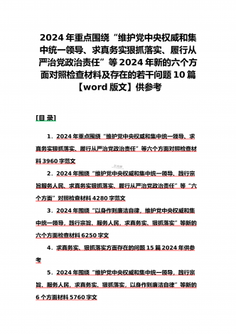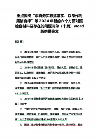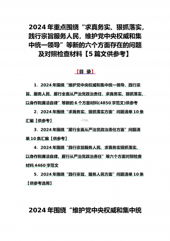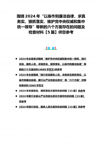 {10篇word版范文}重点围绕“践行宗旨服务人民、求真务实狠抓落实、以身作则廉洁自律,维护党中央权威和集中统一领导,”等2024年新六个方面对照检查材料及存在的问题【供参考】[范文目录]1.2024年围绕“维护党中央权威和集中统一领导、践行宗旨服务人民、求真务实狠抓落实、以身作则廉洁自律”等“六个方面”对照检查材料4340字范文2.2024年围绕“求真务实、狠抓落实方面”问题清单10条汇编【供参考】3.2024年树立和践行正确政绩观方面存在的问题原因及整改材料1740字范文4.2024年全面围...