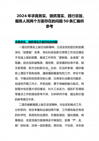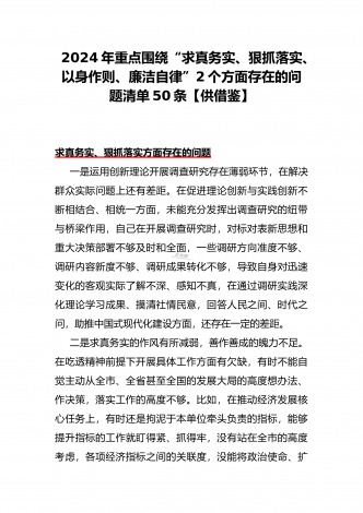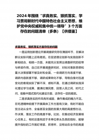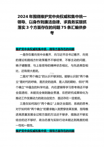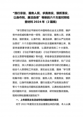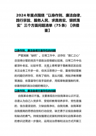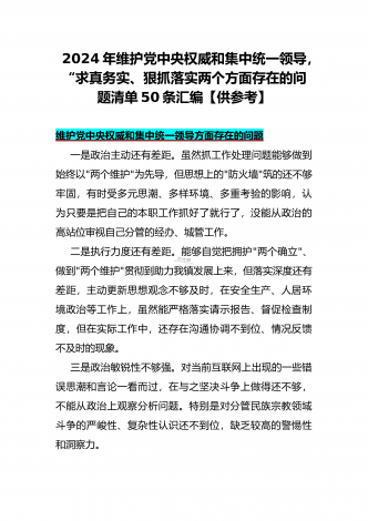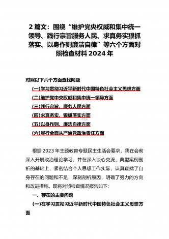 2024年重点围绕“践行宗旨服务人民、维护党中央权威和集中统一领导、求真务实狠抓落实、树立和践行正确政绩观”等新六个方面存在的多个问题与对照检查材料【10份】word版例文供参考