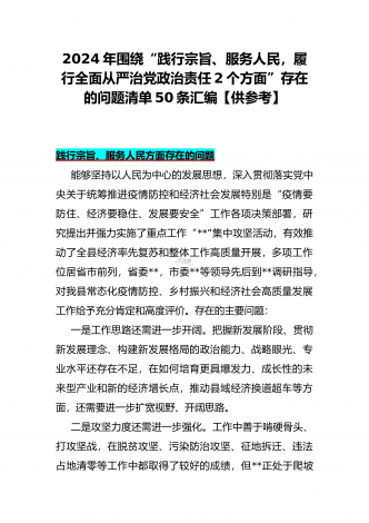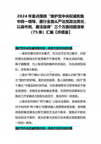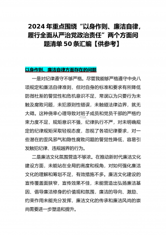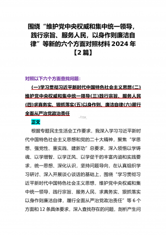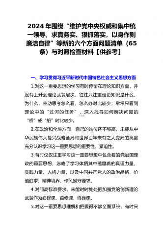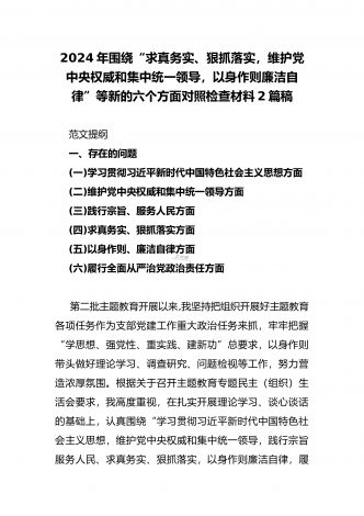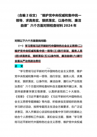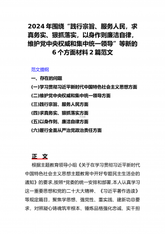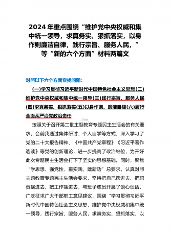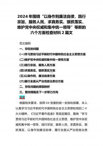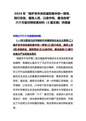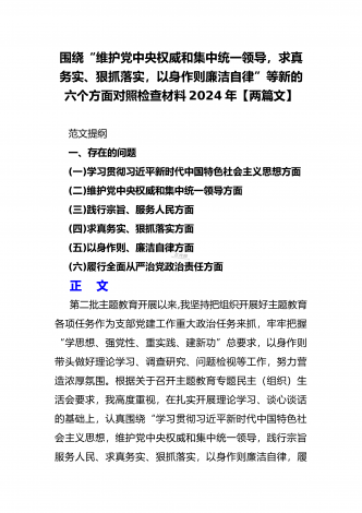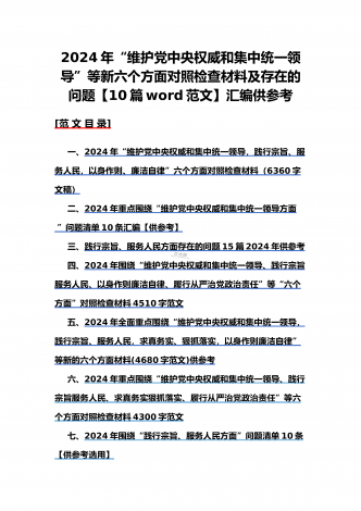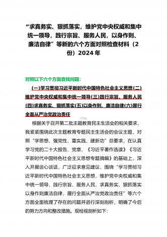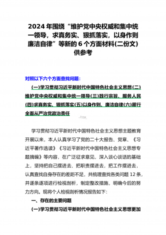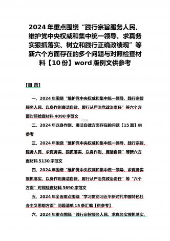 2024年重点围绕“践行宗旨服务人民、维护党中央权威和集中统一领导、求真务实狠抓落实、树立和践行正确政绩观”等新六个方面存在的多个问题与对照检查材料【10份】word版例文供参考[目录]一、2024年围绕“维护党中央权威和集中统一领导、践行宗旨服务人民、以身作则廉洁自律、履行从严治党政治责任”等六个方面对照检查材料4090字范文二、2024年以身作则、廉洁自律方面存在的问题【15篇】供参考三、2024年围绕“维护党中央权威和集中统一领导,践行宗旨、服务人民,求真务实、狠抓落实,以身作则、廉洁自律...