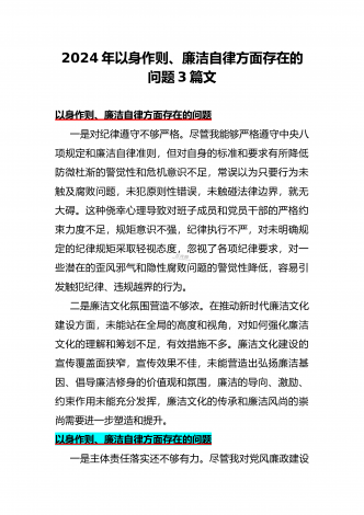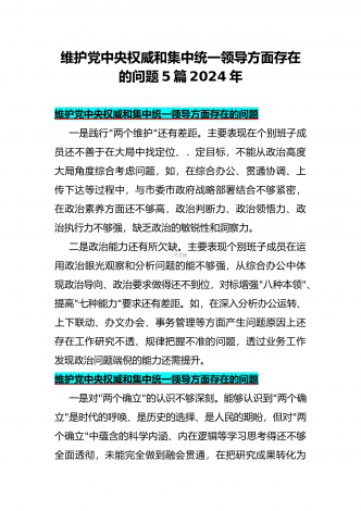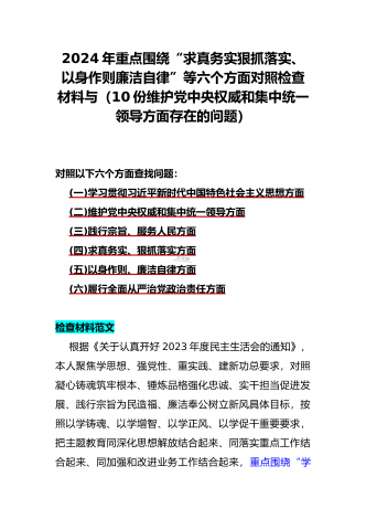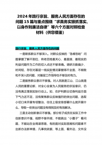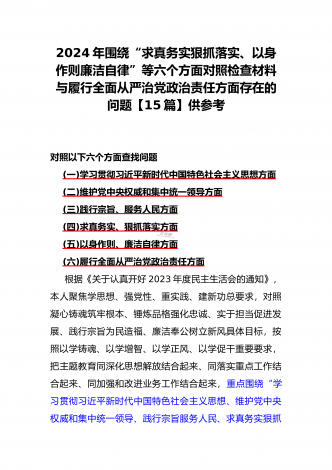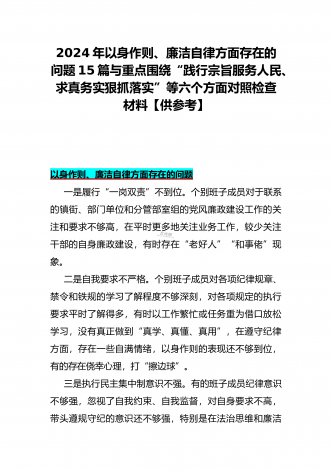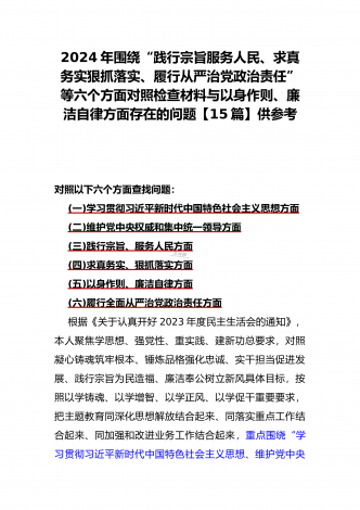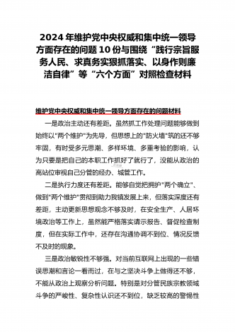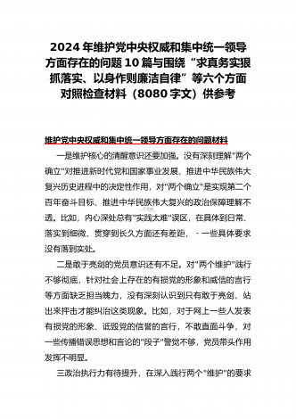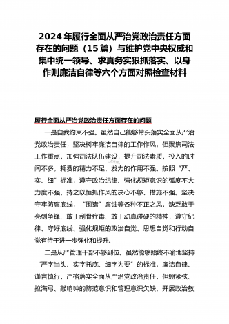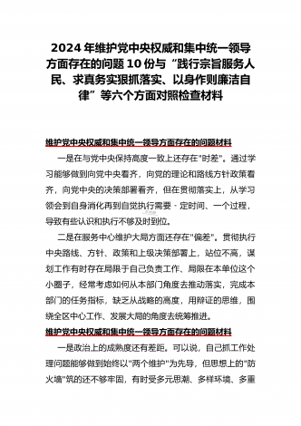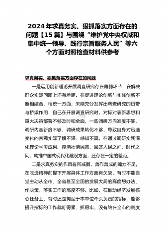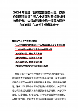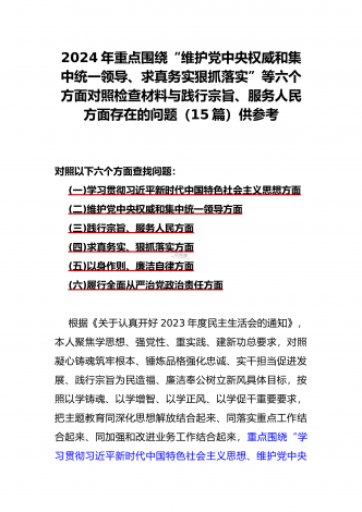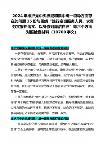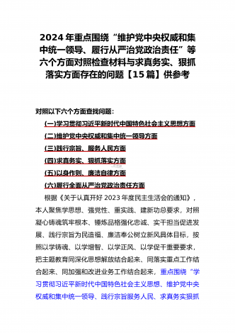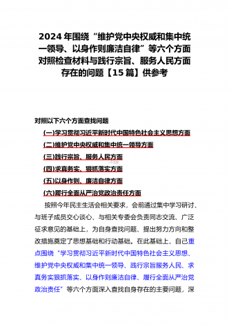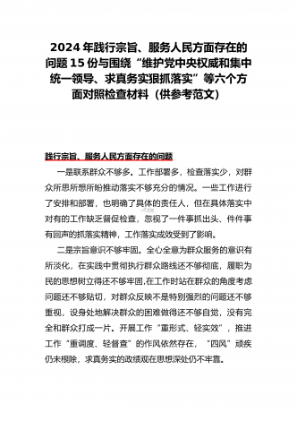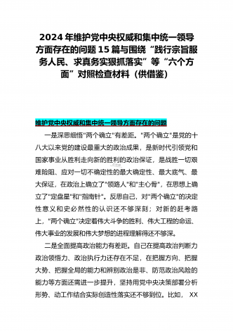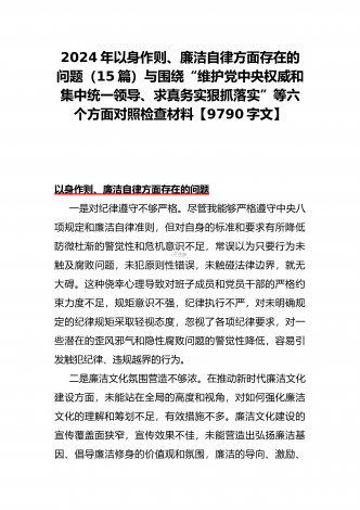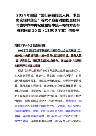 2024年维护党中央权威和集中统一领导方面存在的问题15份与围绕“践行宗旨服务人民、求真务实狠抓落实、以身作则廉洁自律”等六个方面对照检查材料(10700字文)