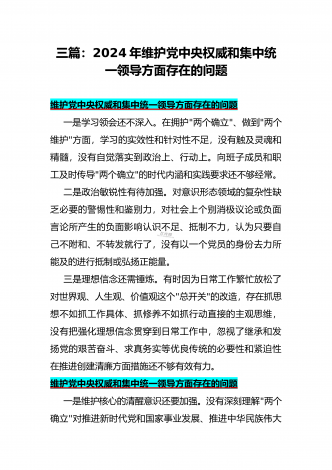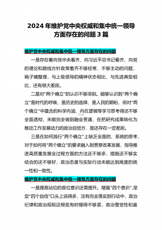 2024年维护党中央权威和集中统一领导方面存在的问题15份与围绕“践行宗旨服务人民、求真务实狠抓落实、以身作则廉洁自律”等六个方面对照检查材料(10700字文)维护党中央权威和集中统一领导方面存在的问题一是存在着向党中央看齐、向习近平总书记看齐、向党的理论和路线方针政策看齐不够经常、不够主动的问题,稿子铺整理,与上级领导的精神状态相比,与先进典型相比,还有很大差距。二是对"两个确立"的认识不够深刻。能够认识到"两个确立"是时代的呼唤、是历史的选择、是人民的期盼,但对"两个确立"中蕴含的科学内涵、...