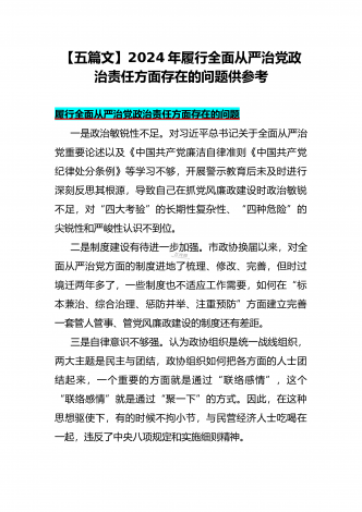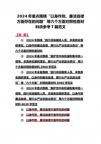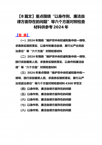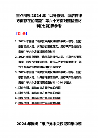 2024年维护党中央权威和集中统一领导方面存在的问题等“六个方面”对照检查材料【6篇范文稿】供参考选用目录2024年围绕“践行宗旨服务人民、求真务实狠抓落实、以身作则廉洁自律、履行从严治党政治责任”等六个方面对照检查材料2024年围绕“维护党中央权威和集中统一领导、践行宗旨服务人民、以身作则廉洁自律、履行从严治党政治责任”等“六个方面”对照检查材料2024年重点围绕“维护党中央权威和集中统一领导、践行宗旨服务人民、求真务实狠抓落实、履行从严治党政治责任”等六个方面对照检查材料维护党中央权...