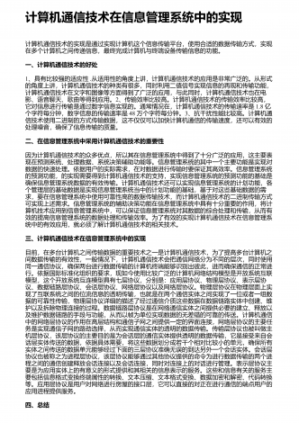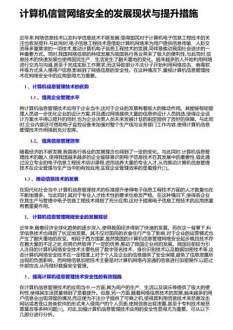 计算机信管网络安全的发展现状与提升措施近年来,网络信息技术以及科学信息技术不断发展,使得国民对于计算机电子信息工程技术的关注也愈发提升,与此同时,电子信息工程技术是借助计算机网络来为用户提供信息传输、人际交流等多重需求的一项技术,推动计算机电子信息工程技术的发展,同样是推动我国社会进步的一种重要方式。同时,我国网络信息的持续发展为我国各行各业带来了极大的便利性,与此同时,信息技术的快速发展也使得国民生产、生活发生了翻天覆地的变化。越来越多的人开始利用网络进行交流与沟通,甚至于完成实际工作需求,而...