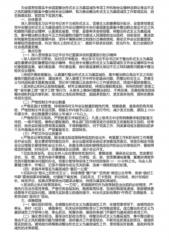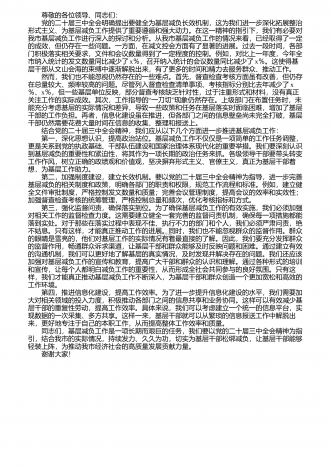 尊敬的各位领导、同志们: 党的二十届三中全会明确提出要健全为基层减负长效机制,这为我们进一步深化拓展整治形式主义、为基层减负工作提供了重要遵循和强大动力。在这一精神的指引下,我们有必要对我市基层减负工作进行深入的探讨和分析。从我市基层减负工作的情况来看,已经取得了一定的成效,但仍存在一些问题。一方面,在减文控会方面有了显著的进展。过去一段时间,各部门积极落实相关要求,文件和会议数量得到了一定程度的控制。例如,对比上一年度,今年全市纳入统计的发文数量同比减少了x%,召开纳入统计的会议数量同比...