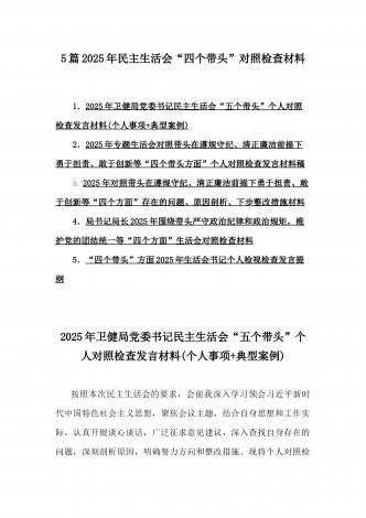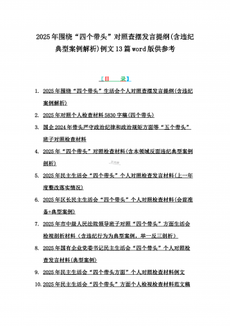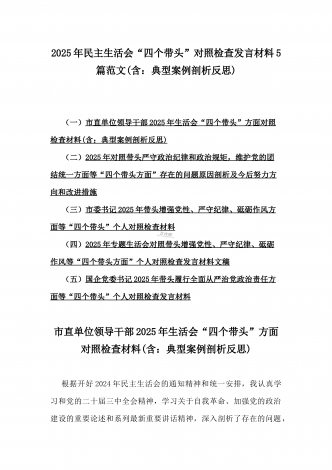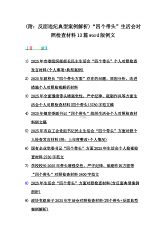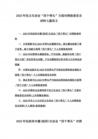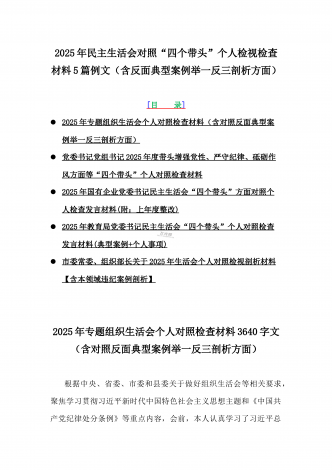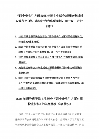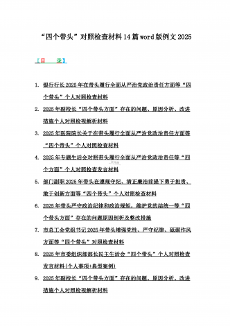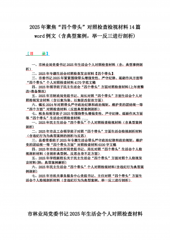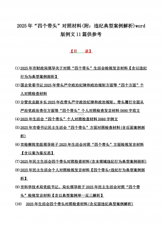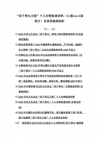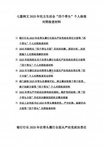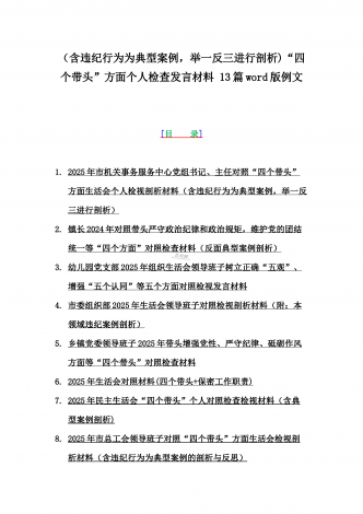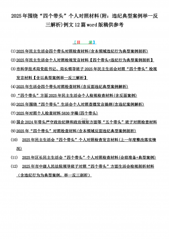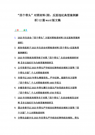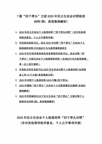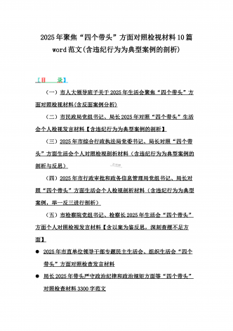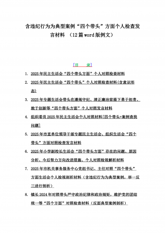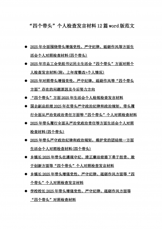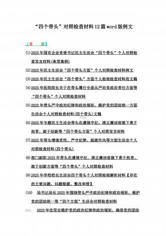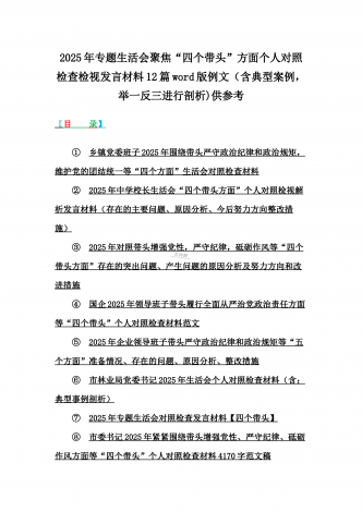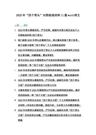 2025年专题生活会聚焦“四个带头”方面个人对照检查检视发言材料12篇word版例文(含典型案例,举一反三进行剖析)供参考【目录】① 乡镇党委班子2025年围绕带头严守政治纪律和政治规矩,维护党的团结统一等“四个方面”生活会对照检查材料② 2025年中学校长生活会“四个带头方面”个人对照检视解析发言材料(存在的主要问题、原因分析、今后努力方向整改措施)③ 2025年对照带头增强党性,严守纪律,砥砺作风等“四个带头方面”存在的突出问题、产生问题的原因分析及努力方向和改进措施④ 国企2025年领导班...