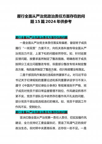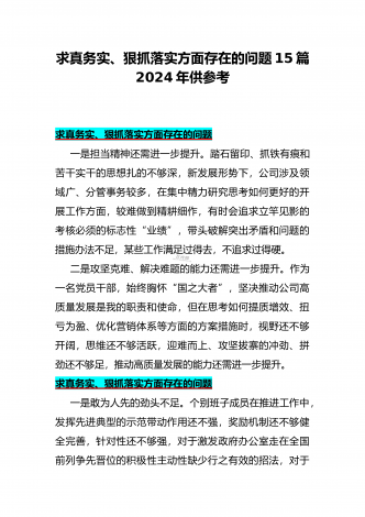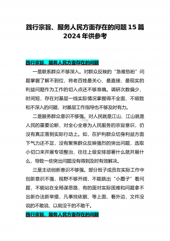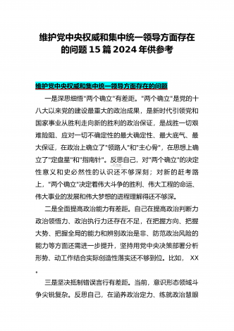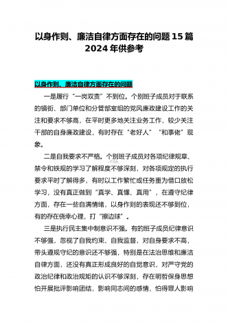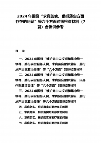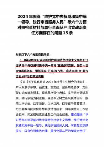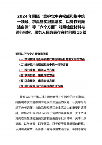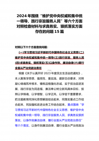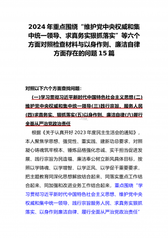 2024年围绕“维护党中央权威和集中统一领导、求真务实狠抓落实、以身作则廉洁自律”等“六个方面”对照检查材料与践行宗旨、服务人民方面存在的问题15篇