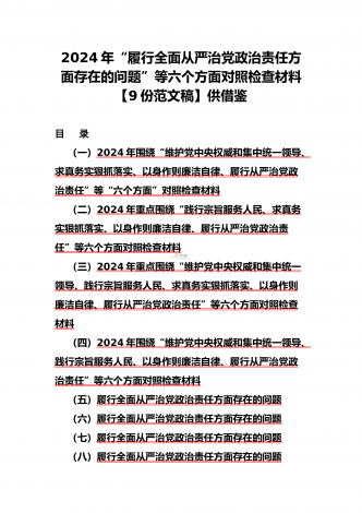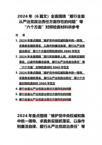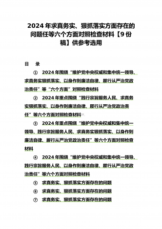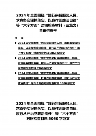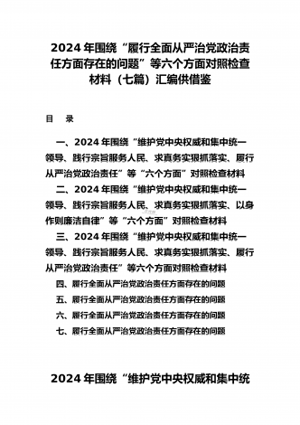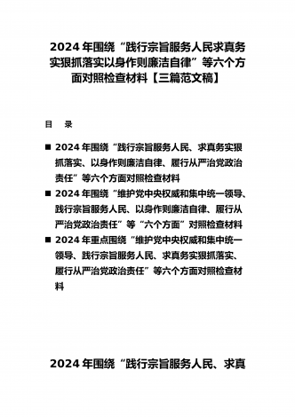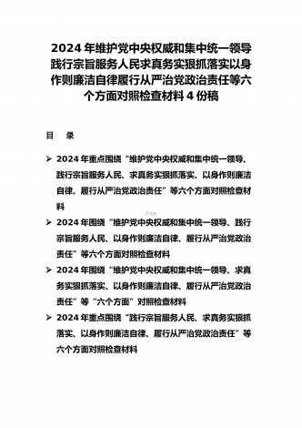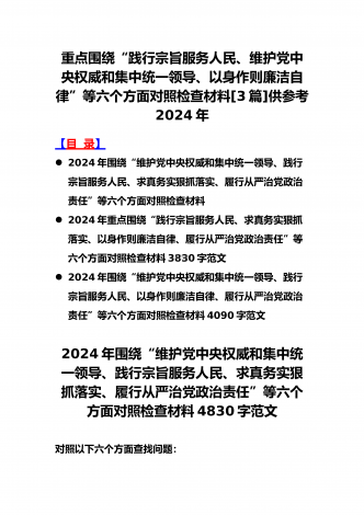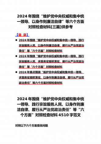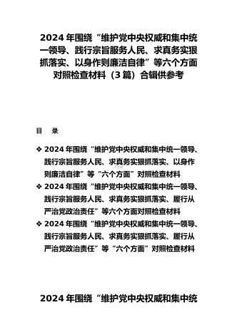 2024年围绕“维护党中央权威和集中统一领导、求真务实狠抓落实、以身作则廉洁自律”等“六个方面”对照检查材料与践行宗旨、服务人民方面存在的问题15篇对照以下六个方面查找问题(一)学习贯彻习近平新时代中国特色社会主义思想方面(二)维护党中央权威和集中统一领导方面(三)践行宗旨、服务人民方面(四)求真务实、狠抓落实方面(五)以身作则、廉洁自律方面(六)履行全面从严治党政治责任方面按照XX召开第二批主题教育民主生活会的相关指示,我围绕本次主题教育专题民主生活会的议题,认真学习习近平总书记在中央政治局专...