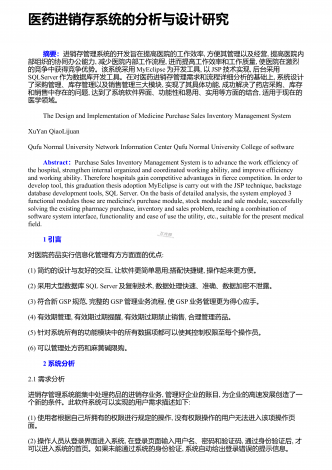 医药进销存系统的分析与设计研究 摘要:进销存管理系统的开发旨在提高医院的工作效率,方便其管理以及经营,提高医院内部组织的协同办公能力,减少医院内部工作流程,进而提高工作效率和工作质量,使医院在激烈的竞争中获得竞争优势。该系统采用MyEclipse为开发工具,以JSP技术实现,后台采用SQLServer作为数据库开发工具。在对医药进销存管理需求和流程详细分析的基础上,系统设计了采购管理、库存管理以及销售管理三大模块,实现了其具体功能,成功解决了药店采购、库存和销售中存在的问题,达到了系统软件界面...