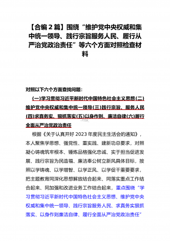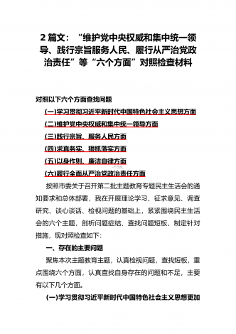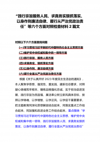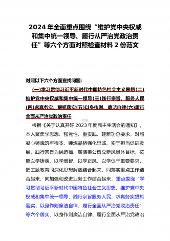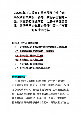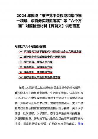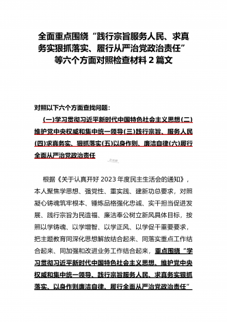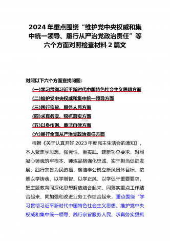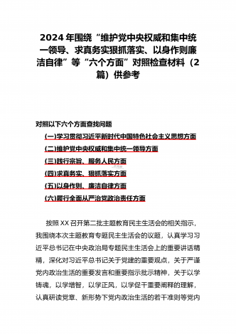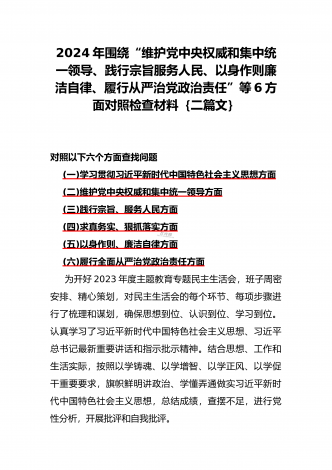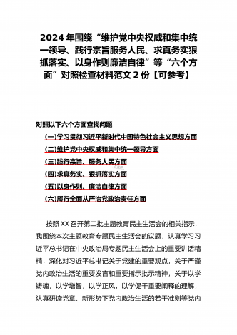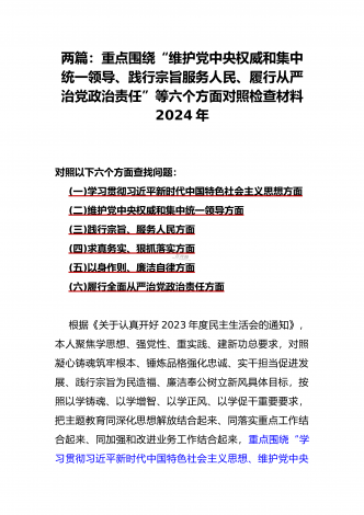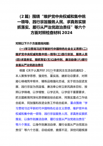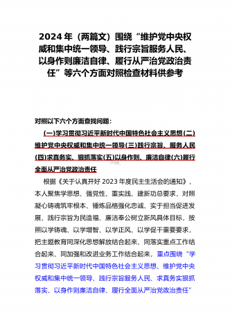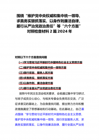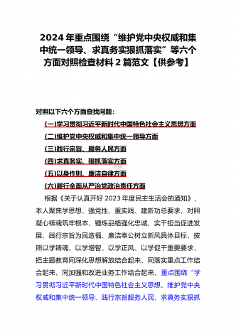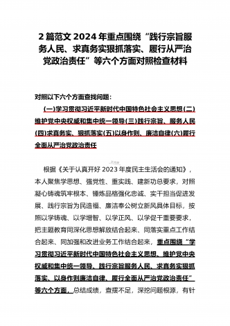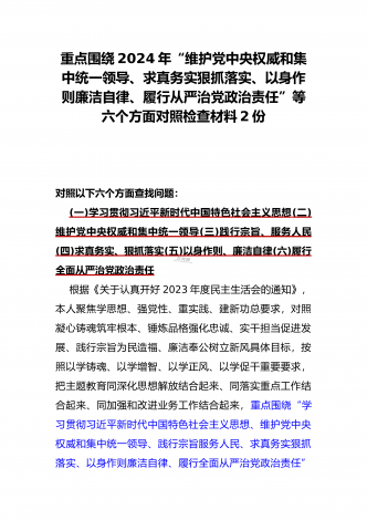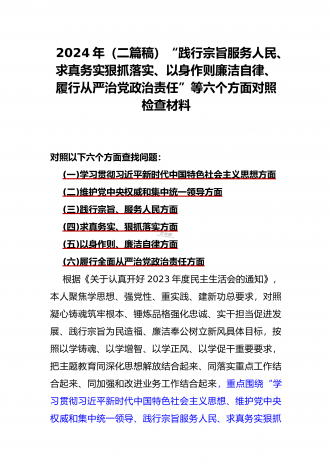 二篇文:2024年重点围绕“践行宗旨服务人民、求真务实狠抓落实、以身作则廉洁自律、履行从严治党政治责任、维护党中央权威和集中统一领导”等六个方面对照检查材料【供参考】