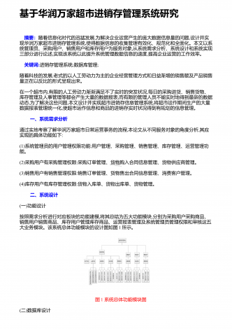 基于华润万家超市进销存管理系统研究 摘要:随着信息化时代的迅猛发展,为解决企业运营产生的庞大数据信息量的问题,设计并实现华润万家超市进销存管理系统,使得数据信息的收集管理有效化、规范化和全面化。本文以系统管理员、采购用户、销售用户和库存用户为服务对象,从系统需求分析、系统设计和系统实现三部分进行论述,实现该系统以此提升系统管理数据信息的速度,提高企业运营的工作效率。 关键词:进销存管理系统;数据库管理;随着科技的发展,老式的以人工劳动力为主的企业经营管理方式和日益渐增的销售额及产品销售量正在以反...