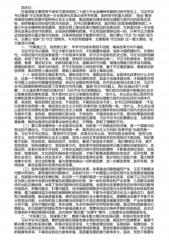 同志们: 在省部级主要领导干部学习贯彻党的二十届三中全会精神专题研讨班开班式上,习近平总“”“书记强调守正创新是进一步全面深化改革必须牢牢把握、始终坚守的重大原则,指出要坚持继续完善和发展中国特色社会主义制度、推进国家治理体系和治理能力现代化的改革总目”标,始终朝着总目标指引的方向前进。总书记的重要讲话,是对我们全面准确理解党的二十届三中全会精神的系统辅导,是新征程上推动改革行稳致远的全面动员,尤其是对进一步全面深化改革必须坚守的原则,必须深刻理解和把握。守正和创新是辩证统一的,只有守正才...
