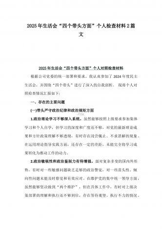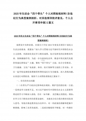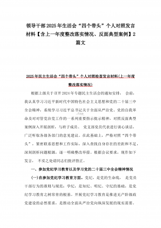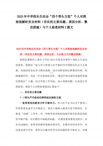 2025年“四个带头”个人对照检视材料(含违纪行为典型案例解析)与高校校长生活会“四个带头”个人对照检视解析发言材料(存在的主要问题、原因分析、整改措施)2篇文
