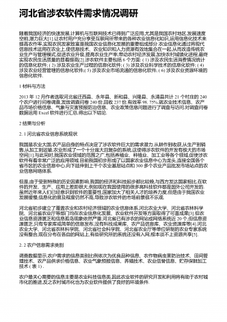 河北省涉农软件需求情况调研随着我国经济的快速发展,计算机与互联网技术已得到广泛应用,尤其是我国农村地区,发展速度空前,潜力巨大[1].让农村用户充分享受互联网所带来的各种农业信息化知识,运用信息化技术来提高农作率,实现农民发家致富是我国农业信息化发展的重要组成部分.农业信息化通过将现代信息技术运用在农业上,使信息技术、农业知识和人力资源有效地集合在一起,从而改造传统农业生产与管理模式,促进农业升级,提高农业生产率,带动农村经济发展,加快农村城镇化进程,最终实现农民生活质量的显着提高[2].涉农软...