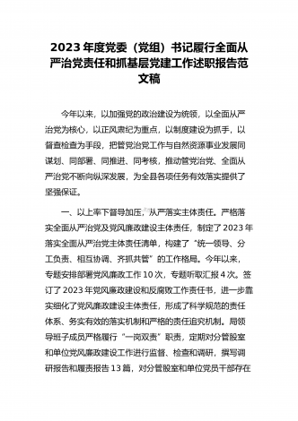 2023年党组织书记落实全面从严治党主体责任、抓基层党建和党风廉政建设工作总结范文稿 2023年以来,在市委、市政府的坚强领导下,我坚持以习近平新时代中国特色社会主义思想为指导,紧紧围绕深入学习宣传贯彻党的二十大精神主题主线,全面贯彻习近平总书记关于全面从严治党重要论述精神,全面贯彻新时代党的建设总要求,深刻领悟“两个确立”的决定性意义,增强“四个意识”、坚定“四个自信”、做到“两个维护”,与其他班子成员一道认真履行全面从严治党主体责任,严格执行廉洁纪律要求,不断加大管党治党力度,党风廉政建设...