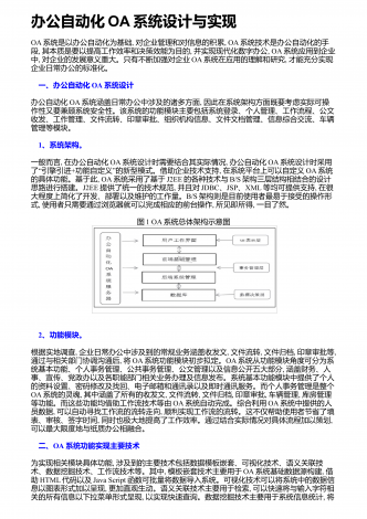 办公自动化OA系统设计与实现OA系统是以办公自动化为基础,对企业管理和对信息的积累,OA系统技术是办公自动化的手段,其本质是要以提高工作效率和决策效能为目的,并实现现代化数字办公,OA系统应用到企业中,对企业的发展意义重大。只有不断加强对企业OA系统在应用的理解和研究,才能充分实现企业日常办公的标准化。 一、办公自动化OA系统设计办公自动化OA系统涵盖日常办公中涉及的诸多方面,因此在系统架构方面既要考虑实际可操作性又要兼顾系统安全性。该系统的功能模块主要包括系统登录、个人管理、工作流程、公文收发...