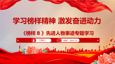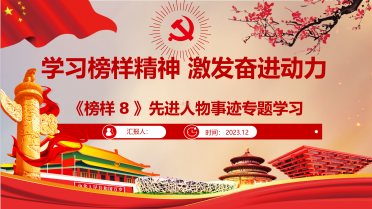 学习榜样精神激发奋进动力《榜样8》先进人物事迹专题学习汇报人:时间:2023.12为深入学习贯彻习近平新时代中国特色社会主义思想,持续推动主题教育走深走实,教育引导基层党组织和广大党员干部学习榜样、争当先进,主动作为、担当有为,中央组织部、中央学习贯彻习近平新时代中国特色社会主义思想主题教育领导小组办公室、中央广播电视总台联合制作了《榜样8》专题节目。导读节目展示了钱七虎、刘玲琍、唐菊兴、吴惠芳、李桂科、热孜万古丽·沙吾提6名党员和浙江省余姚市梁弄镇横坎头村党委的典型事迹、现场访谈,生动展现学习...
