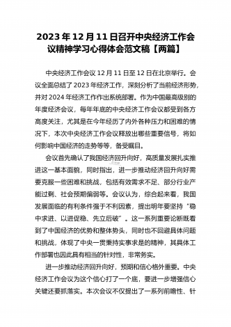 2023年12月11日召开中央经济工作会议精神学习心得体会范文稿【两篇】