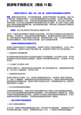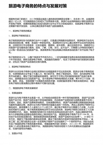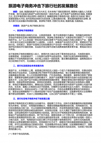 旅游电子商务冲击下旅行社的发展路径 摘要:当前,我国的旅游产业方兴未艾,在未来有广阔的发展空间,需要有大量的人力资源作支撑。旅行社就是与旅游产业密切相关的一类经济实体,由于旅游产业的附加价值高,发展潜力大,在近年备受各行各业领军人物的关注,随着旅游电子商务的兴起,“”各旅行社也纷纷遇冷,发展受到较大冲击,如何发挥实体旅行社的优势,以更优惠的价格、更优质的服务吸引游客,是各大旅行社应该重点考虑的问题。旅游电子商务,对旅行社来说,既是机遇,也是挑战。 关键词:旅游产业,电子商务,旅行社 一、旅...