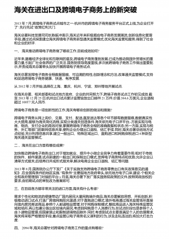 海关在进出口及跨境电子商务上的新突破2013年7月,跨境电子商务试点城市之一-杭州市的跨境电子商务服务平台正式上线,为企业打开‘了.“先行先试政策红利大门.海关总署科技发展司司长陈振冲表示,海关近年来积极顺应电子商务发展潮流,创新信息化管理手段,通过试点探索建立海关跨境电子商务新型通关监管模式,优化海关监管和服务,得到了社会和企业的好评.一、海关推动跨境电子商务做了哪些工作,目前成效如何?近年来,随着经济全球化和互联网的普及,跨境电子商务蓬勃发展,已成为推动我国外贸增长的重要力量,引起厂社会各界...