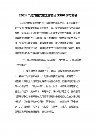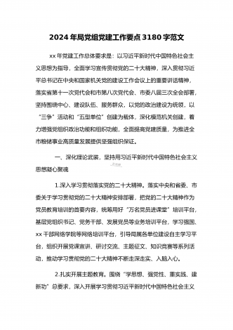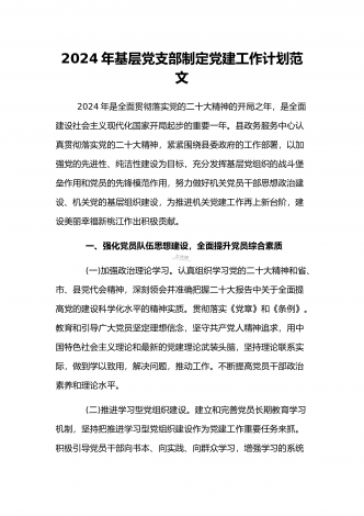 基层党支部制定2024年党建工作计划1800字范文 为进一步贯彻全面从严治党要求,认真落实党建工作责任制,有力推动基层党支部科学化、制度化、规范化建设,切实发挥基层党组织的战斗堡垒作用和党员的先锋模范作用,结合嘎查实际,制定2024年度党建工作计划如下: 一、指导思想 以习近平新时代中国特色社会主义思想为指导,坚决贯彻党的基本理论基本路线、基本方略,深入贯彻习近平总书记关于内蒙古工作重要讲话重要指示批示精神,全面贯彻新时代党的建设总要求和新时代党的组织路线,坚持党要管党、从严治党,增强“四...