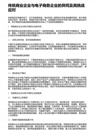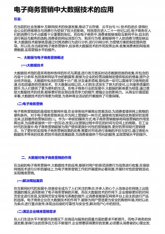 电子商务营销中大数据技术的应用引言:在当前的社会发展中,互联网技术的快速发展,推动了云存储、云平台与5G技术的进步,使得社会公众的思维理念与消费行为受到了较大的影响。特别是在进入二十一世纪以后,电子商务在人们的消费行为中占据着十分重要的地位。而在电子商务中,消费者能够借助互联网平台,自主的进行商品与服务的选购,消费者的网站浏览行为、购买行为等,都能够将个人的消费习惯反映出来,大数据技术能够就是通过对其消费行为进行分析,进行归纳分析,为营销方案的制定提供指导。所以说,在当前的电子商务营销中,应该将...