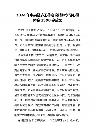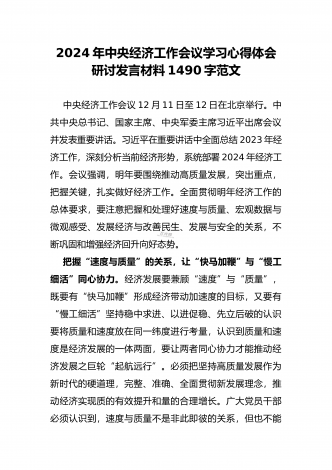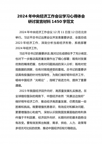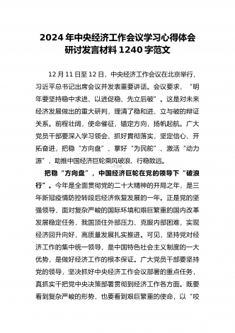 2024年中央经济工作会议学习心得体会研讨发言材料1450字范文