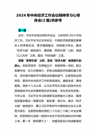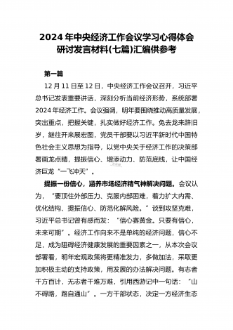 2024年中央经济工作会议学习心得体会研讨发言材料1450字范文2024年中央经济工作会议12月11日至12日在北京举行。习近平总书记出席会议并发表重要讲话,全面总结2023年经济工作,深刻分析当前经济形势,系统部署2024年经济工作。习近平总书记的重要讲话,既对过往成绩给予了充分肯定,也对下一步推动高质量发展作出了精心部署;既有对发展优势的精准把握,也有对问题挑战的深入分析;既有对宏观数据的洞察,也有对微观感受的重视。总书记的重要讲话具有极强的针对性指导性,为我们做好明年经济工作,唱响中国经济...