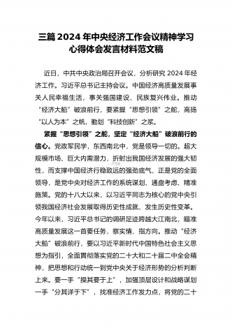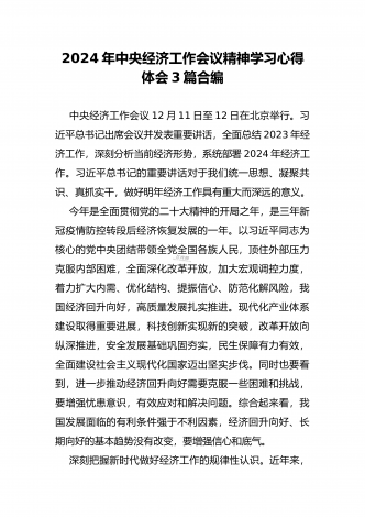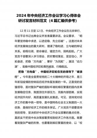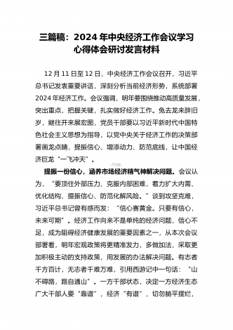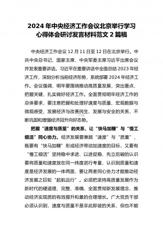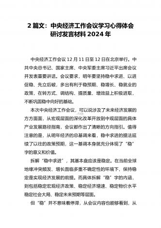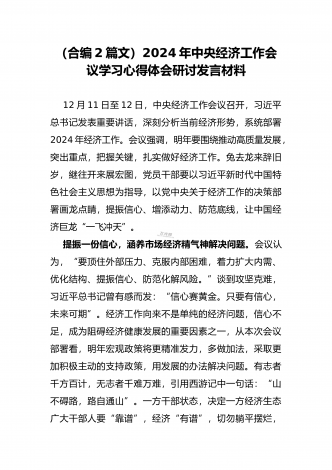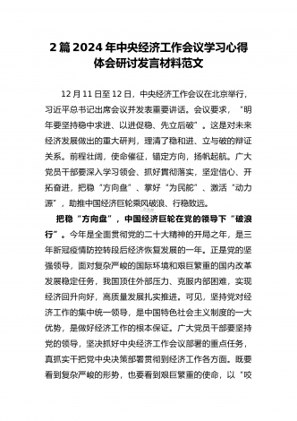 2024年中央经济工作会议学习心得体会研讨发言材料【两篇】供借鉴