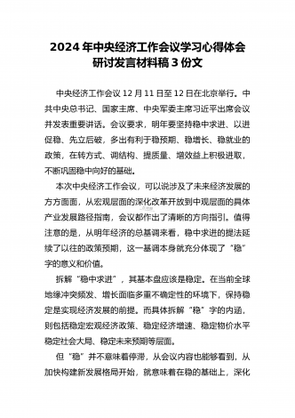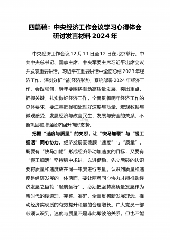 2024年中央经济工作会议学习心得体会研讨发言材料【两篇】供借鉴2024年中央经济工作会议12月11日至12日在北京举行。习近平总书记出席会议并发表重要讲话,全面总结2023年经济工作,深刻分析当前经济形势,系统部署2024年经济工作。习近平总书记的重要讲话,既对过往成绩给予了充分肯定,也对下一步推动高质量发展作出了精心部署;既有对发展优势的精准把握,也有对问题挑战的深入分析;既有对宏观数据的洞察,也有对微观感受的重视。总书记的重要讲话具有极强的针对性指导性,为我们做好明年经济工作,唱响中国经济...