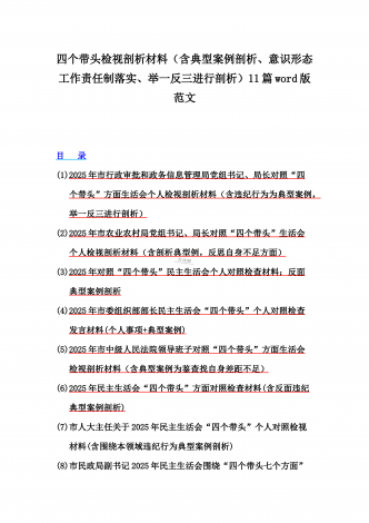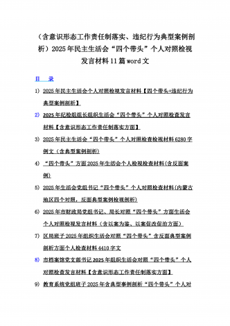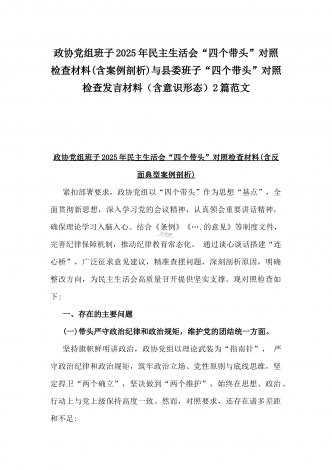 县委班子2025年民主生活会“四个带头”对照检查发言材料(含意识形态)与市财政局党组书记、局长对照“四个带头”个人对照检视发言材料(含以案为鉴、以案促改促治方面)2篇例文县委班子2025年民主生活会“四个带头”对照检查发言材料(含意识形态)根据相关要求,县委班子紧扣会议主题,深入开展学习,广泛征求意见,认真对照检查,深入查找存在的问题,深刻剖析问题产生的原因,明确了整改方向和措施。现将对照检查情况汇报如下:一、存在问题(一)带头严守政治纪律和政治规矩,维护党的团结统一方面一是政治敏锐性不够强,还...
