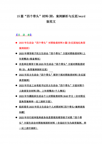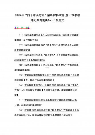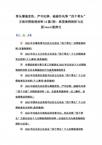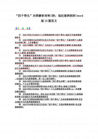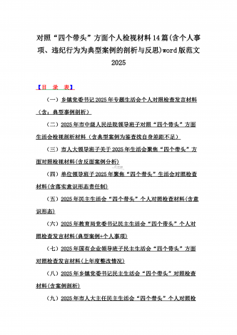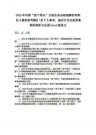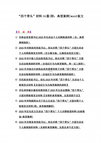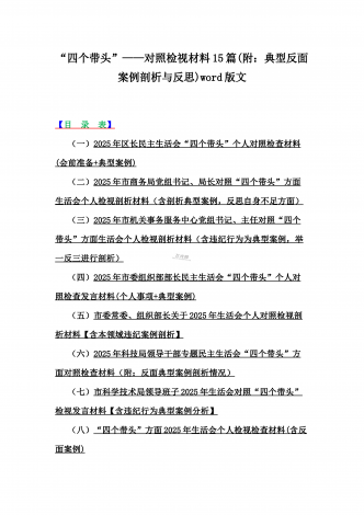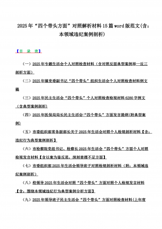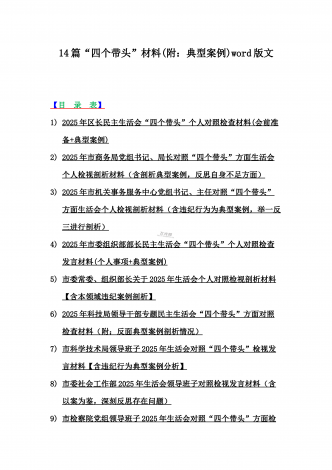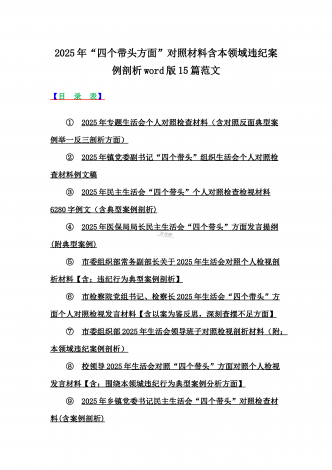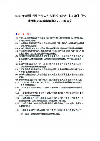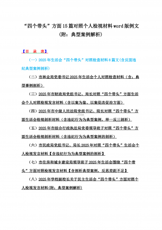 带头严守政治纪律和政治规矩,维护党的团结统一等2025年“四个带头”生活会检视剖析材料15篇稿(附:以违纪行为为典型解析案例与反思)word文【目录表】一、市林业局党委书记2025年生活会个人对照检查材料(含:典型事例剖析)二、2025年市财政局党组书记、局长对照“四个带头”方面生活会个人对照检视发言材料(含以案为鉴、以案促改促治方面)三、2025年市中级人民法院党组书记、院长对照“四个带头”方面生活会检视剖析材料(含违纪行为为典型案例,举一反三剖析)四、2025年市综合行政执法局党委领导班子对...