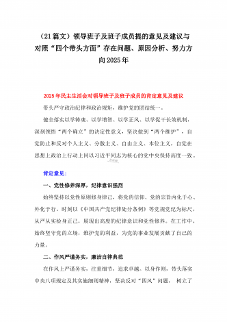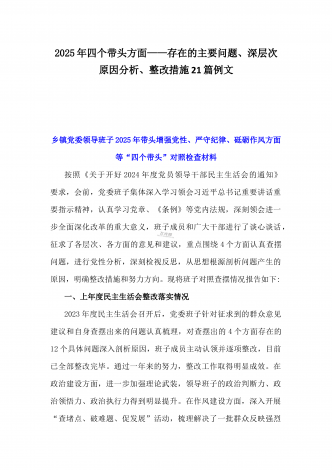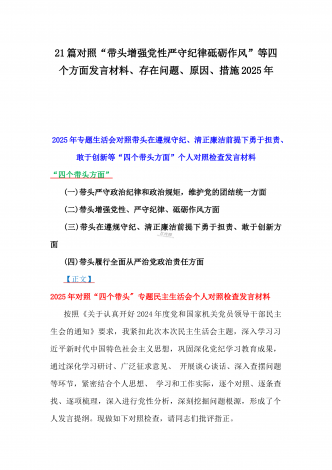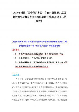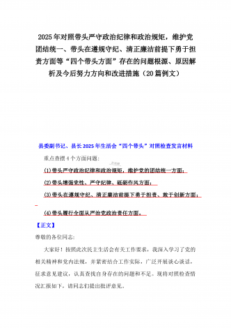 2025年对照带头严守政治纪律和政治规矩,维护党团结统一、带头在遵规守纪、清正廉洁前提下勇于担责方面等“四个带头方面”存在的问题根源、原因解析及今后努力方向和改进措施(20篇例文)县委副书记、县长2025年生活会“四个带头”对照检查发言材料重点查摆4个方面问题:(1)带头严守政治纪律和政治规矩,维护党的团结统一方面;(2)带头增强党性、严守纪律、砥砺作风方面;(3)带头在遵规守纪、清正廉洁前提下勇于担责、敢于创新方面;(4)带头履行全面从严治党政治责任方面。【正文】尊敬的各位同志:大家好!按照此...