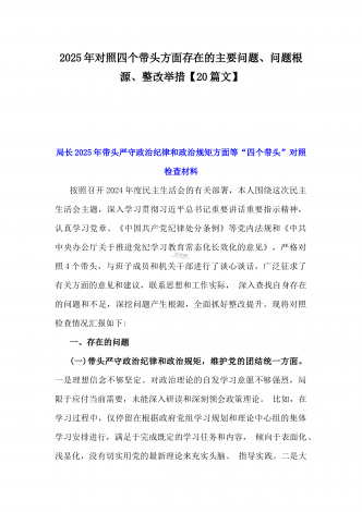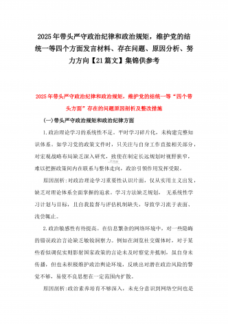 2025年对照带头严守政治纪律和政治规矩,维护党团结统一、带头在遵规守纪、清正廉洁前提下勇于担责方面等“四个带头方面”存在的问题根源、原因解析及今后努力方向和改进措施(20篇例文)