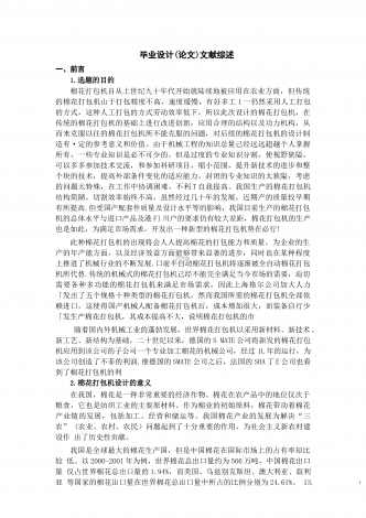 本次设计主要是对棉花打包机设计,通过对其机械结构的设计,使其可以实现棉花自动压缩打包。根据棉花打包工作形式进行工艺分析,可以把此步骤分成压缩和打包两部分,本设计分别对其进行检测试验,分别选择较优的方案。本文第一章,首先,本章介绍了棉花打包机的研究背景,阐述了此次设计对棉花行业的重要意义;第二章,本章介绍了棉花打包机的发展趋势和国内外研究现状,然后阐述棉花打包机的工作原理;第三章,本章主要对外购件的选型以及设计计算和强度校核;第四章,本章对棉花打包机进行主要部件的数据建模以及加工图纸的生成,使其能...