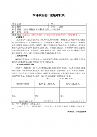 机械设计制造及其自动化专业毕业设计课题申报表申报者题目名称控制反扭矩井下辅助工具的设计题目类型■结构设计类□加工工艺设计类□检测与控制类□实物制作类□软件开发类□模拟仿真类课题内容描述在石油天然气开发工程中,水平井的钻探过程中,用井下马达定向造斜时,会在钻具上产生较大的反扭矩。用PDC钻头钻定向井时,最难处理的问题就是由反扭矩变化引起的工具面控制不稳。钻井工作人员花费了大量的时间来调整工具面,由于每次停泵进行钻具连接,钻井参数改变,或者地层岩性发生变化,或者处理其他许多常规的问题,大扭矩变化会导...