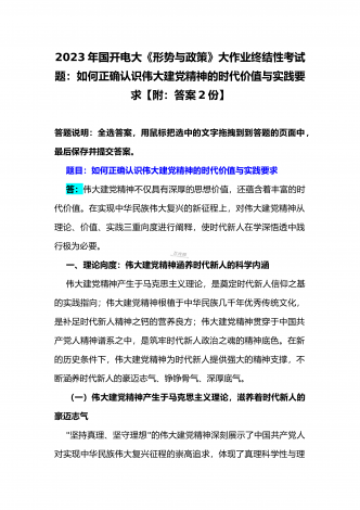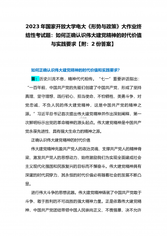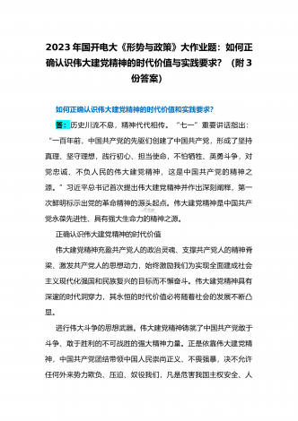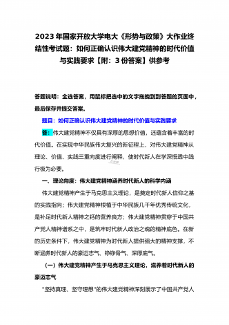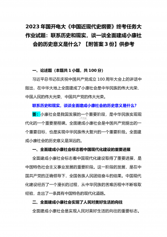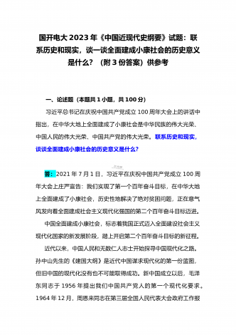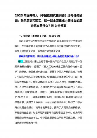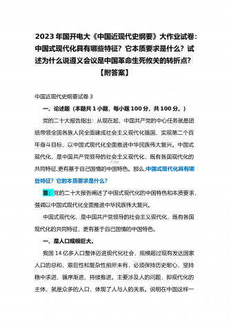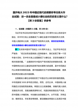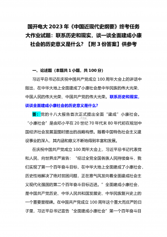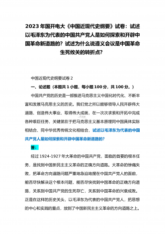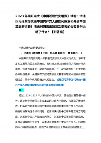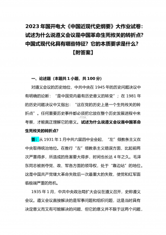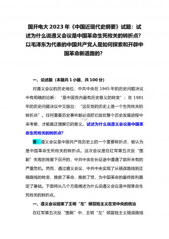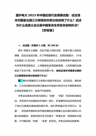 国开电大2023年《中国近现代史纲要》终考任务试题:请试述清末对国家出路的三次探索的失败分别说明了什么?为什么说遵义会议是中国革命生死攸关的转折点?【附答案】一、论述题(本题共1小题,共100分)资本-帝国主义侵略、压迫中国人民的过程,也是中国人民反抗侵略、反抗压迫的过程。为了争取国家独立,实现民族复兴,19世纪后期至20世纪初,中华民族的优秀儿女在屈辱苦难中奋起抗争,为探寻争取民族独立、人民解放和实现国家富强、人民幸福的出路,掀起了生生不息、再接再厉的英勇斗争。请试述清末对国家出路的三次探索的...