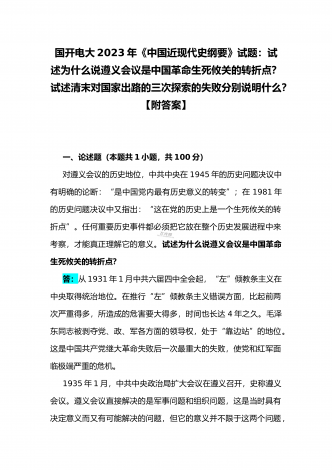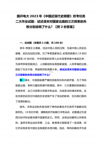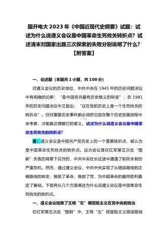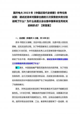 国开电大2023年《中国近现代史纲要》终考任务试题:请试述清末对国家出路的三次探索的失败分别说明了什么?为什么说遵义会议是中国革命生死攸关的转折点?【附答案】