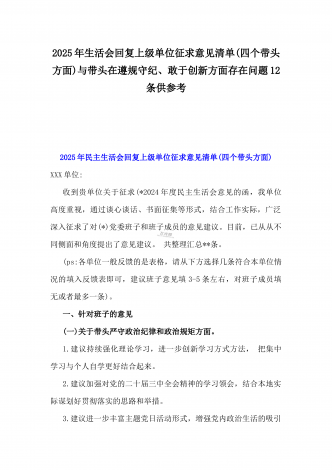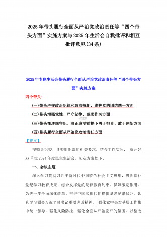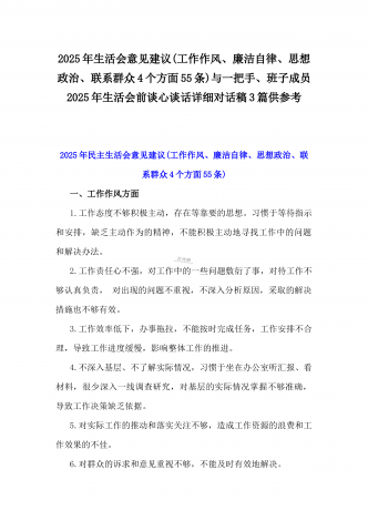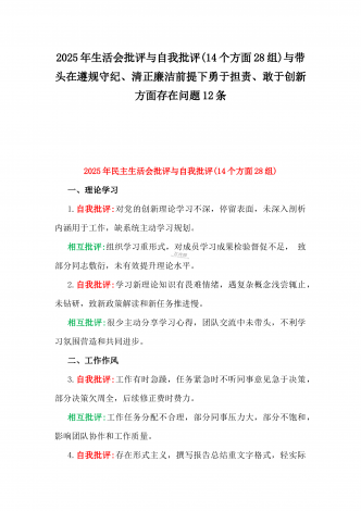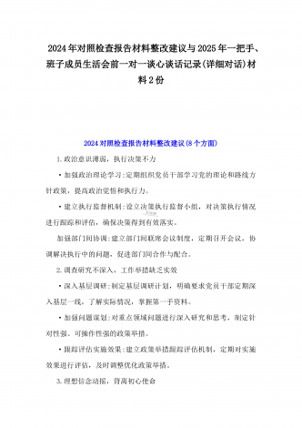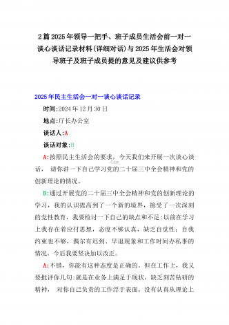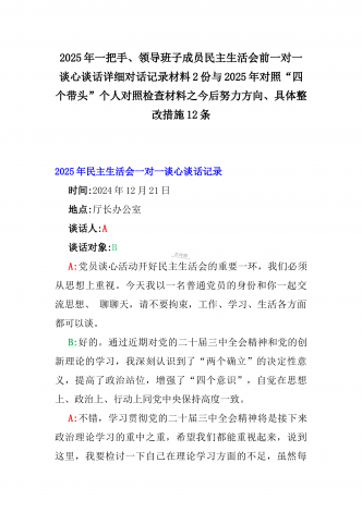 2025年一把手、领导班子成员民主生活会前一对一谈心谈话详细对话记录材料2份与2025年对照“四个带头”个人对照检查材料之今后努力方向、具体整改措施12条2025年民主生活会一对一谈心谈话记录时间:2024年12月21日地点:厅长办公室谈话人:A谈话对象:BA:党员谈心活动开好民主生活会的重要一环,我们必须从思想上重视。今天我以一名普通党员的身份和你一起交流思想、聊聊天,请不要拘束,工作、学习、生活各方面都可以谈。B:好的。通过近期对党的二十届三中全会精神和党的创新理论的学习,我深刻认识到了“两...