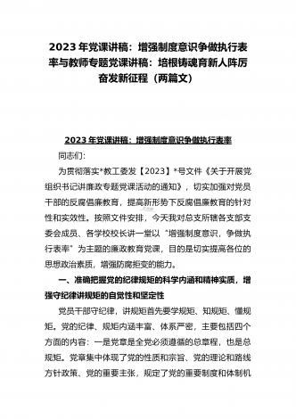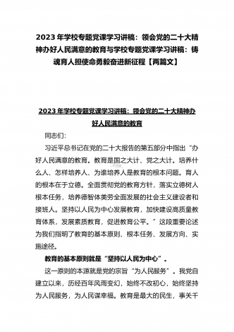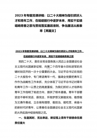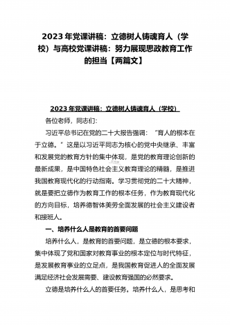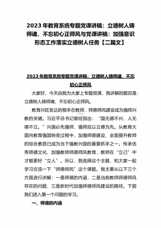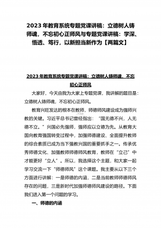 2023年教育系统专题党课讲稿:立德树人铸师魂,不忘初心正师风与专题党课讲稿:以二十大精神为指引抓好人才和青年工作,在砥砺前行中逐梦未来,用实干实绩唱响青春之歌【两篇文】