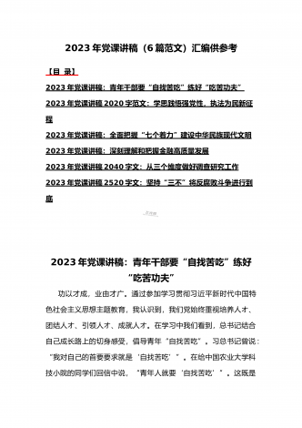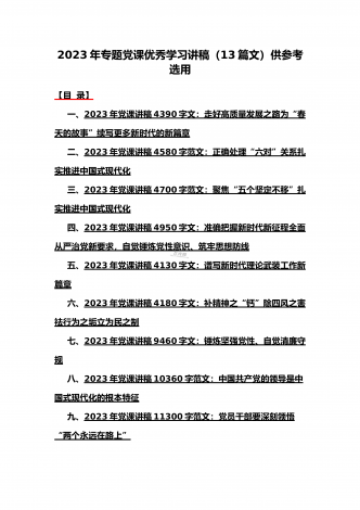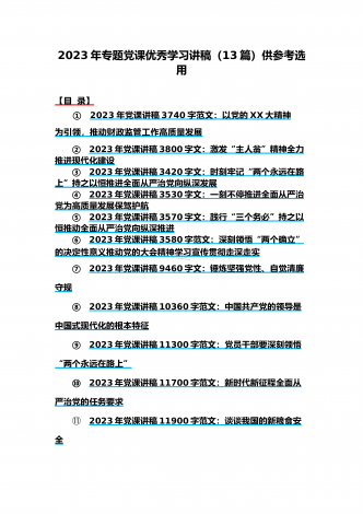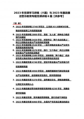 2023年党课学习讲稿(六篇)与2023年廉政廉洁警示教育专题党课讲稿6篇【供参考】【目录】A.2023年党课讲稿3740字范文:以党的XX大精神为引领,推动财政监管工作高质量发展B.2023年党课讲稿3800字文:激发“主人翁”精神全力推进现代化建设C.2023年党课讲稿3420字文:时刻牢记“两个永远在路上”持之以恒推进全面从严治党向纵深发展D.2023年党课讲稿3530字文:一刻不停推进全面从严治党为高质量发展保驾护航E.2023年党课讲稿3570字文:践行“三个务必”持之以恒推动全面从严...